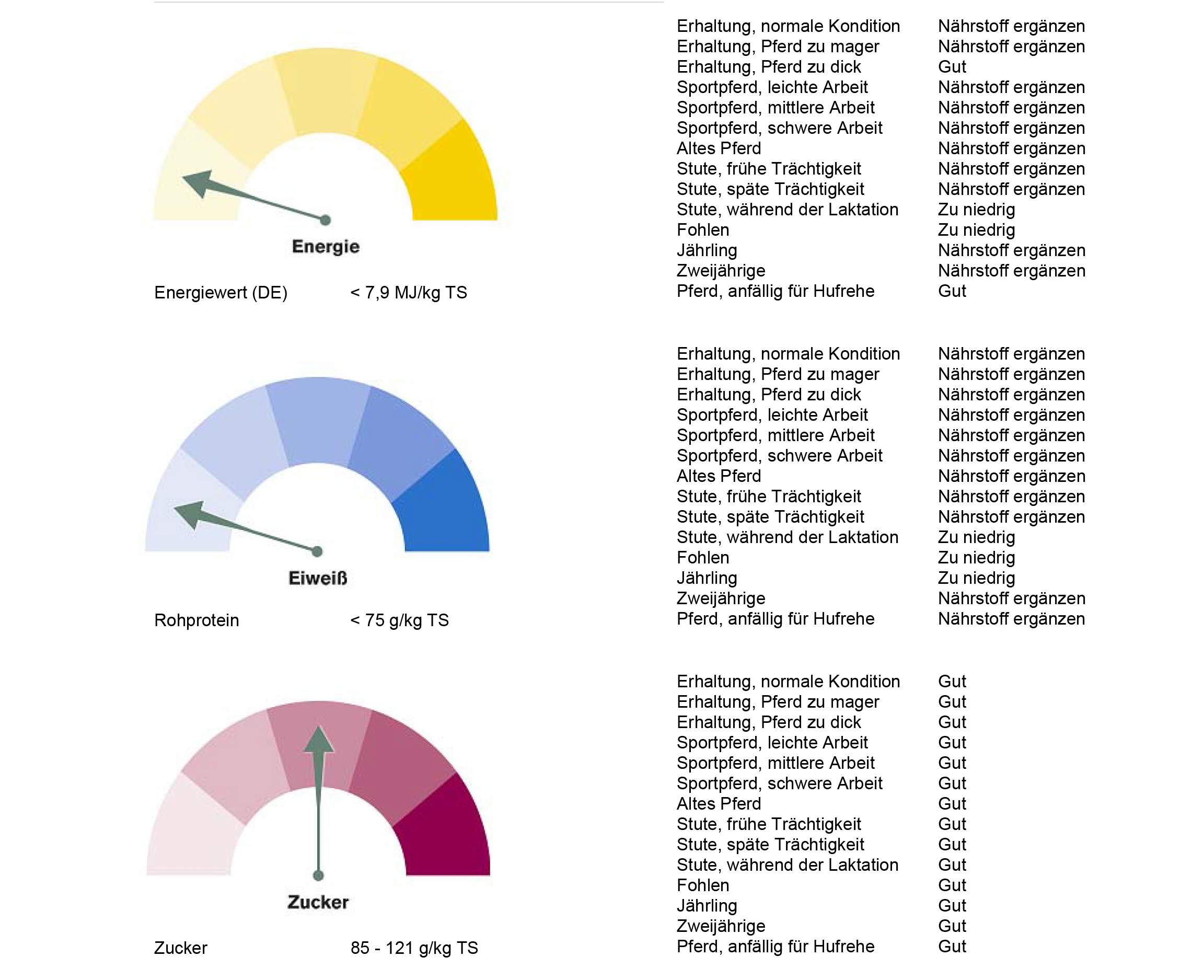 Das war doch überraschend. Das Heu von 2017 (hatten wir beim Einzug in den neuen Stall auf die Schnelle organisiert und gekauft und war ja auch sehr gut) hat im Schnitt mehr als 27% mehr Zucker als das diesjährige! Unsere Pferde haben also ein Jahr lang nun „Süßspeise“ konsumiert :o)) Auch der Energiegehalt war doch deutlich geringer! Super, das wird den Pferden nicht schmecken, aber die Figur wird es uns danken ;o) Na ja, ganz so ist es nicht, aber wir wissen nun, dass das Heu dieses Jahr etwas weniger auf die Figur schlagen wird.
