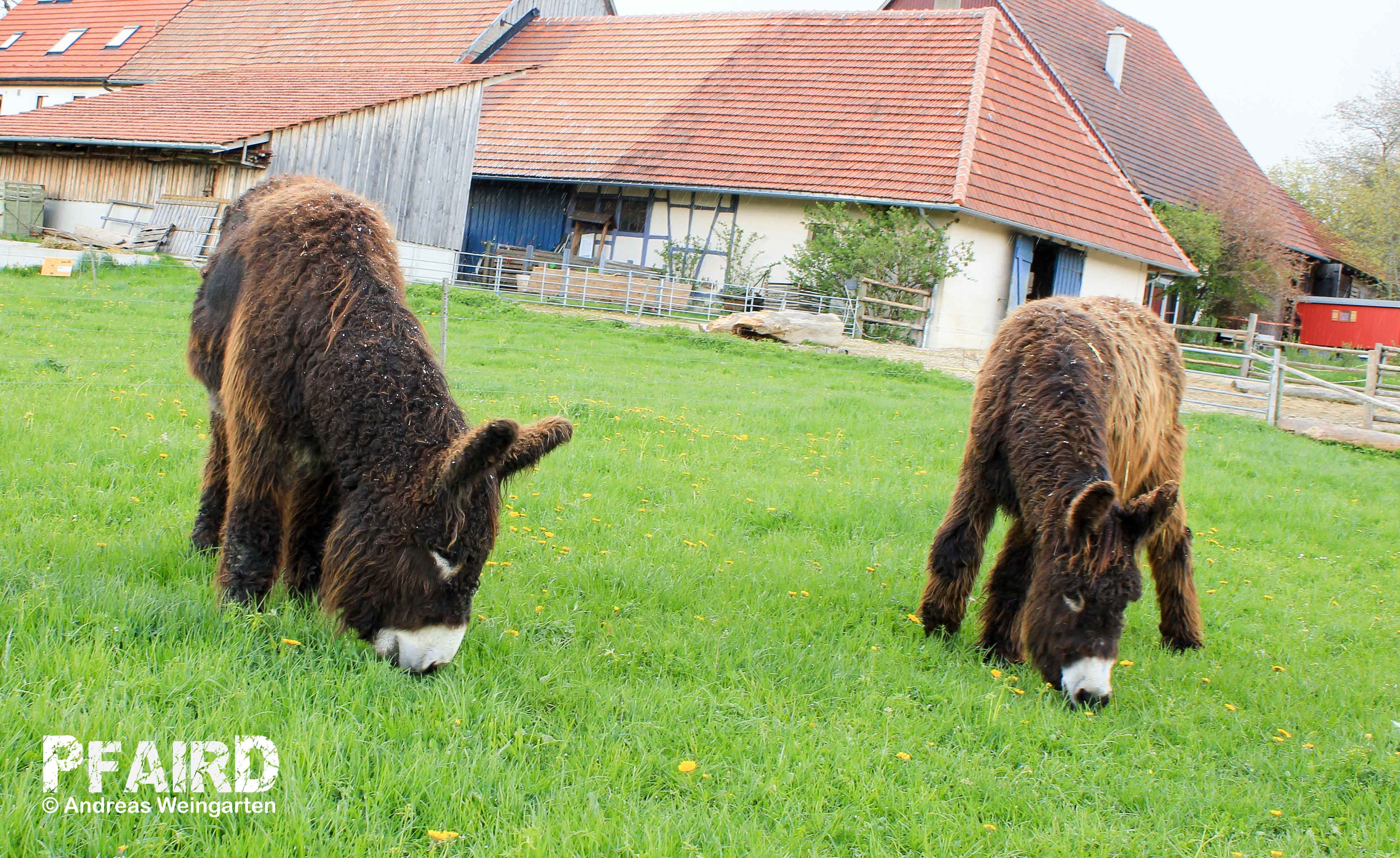 Ich habe diese beiden Poitou-Esel auf dem Bild – Beppo und Robin – auf dem Hofgut Hopfenburg in Münsingen kennengelernt. Wie die meisten Vertreter Ihrer Rasse sind sie mir ruhig und unauffällig begegnet haben mich aber aufgrund Ihrer Größe schon beeindruckt. Sie waren sehr interessiert an unserem Hund, haben sich gerne kraulen lassen. Dann aber haben sie sich wieder der Hauptbeschäftigung des Tages zu gewandt. Durch stetes Versuchen haben sie es geschafft, die Einfriedung Ihres Paddock (bestehend aus zwei gesicherten Holzstangen) selbstständig zu öffnen und sich damit den Weg frei gemacht auf die frische Weide.