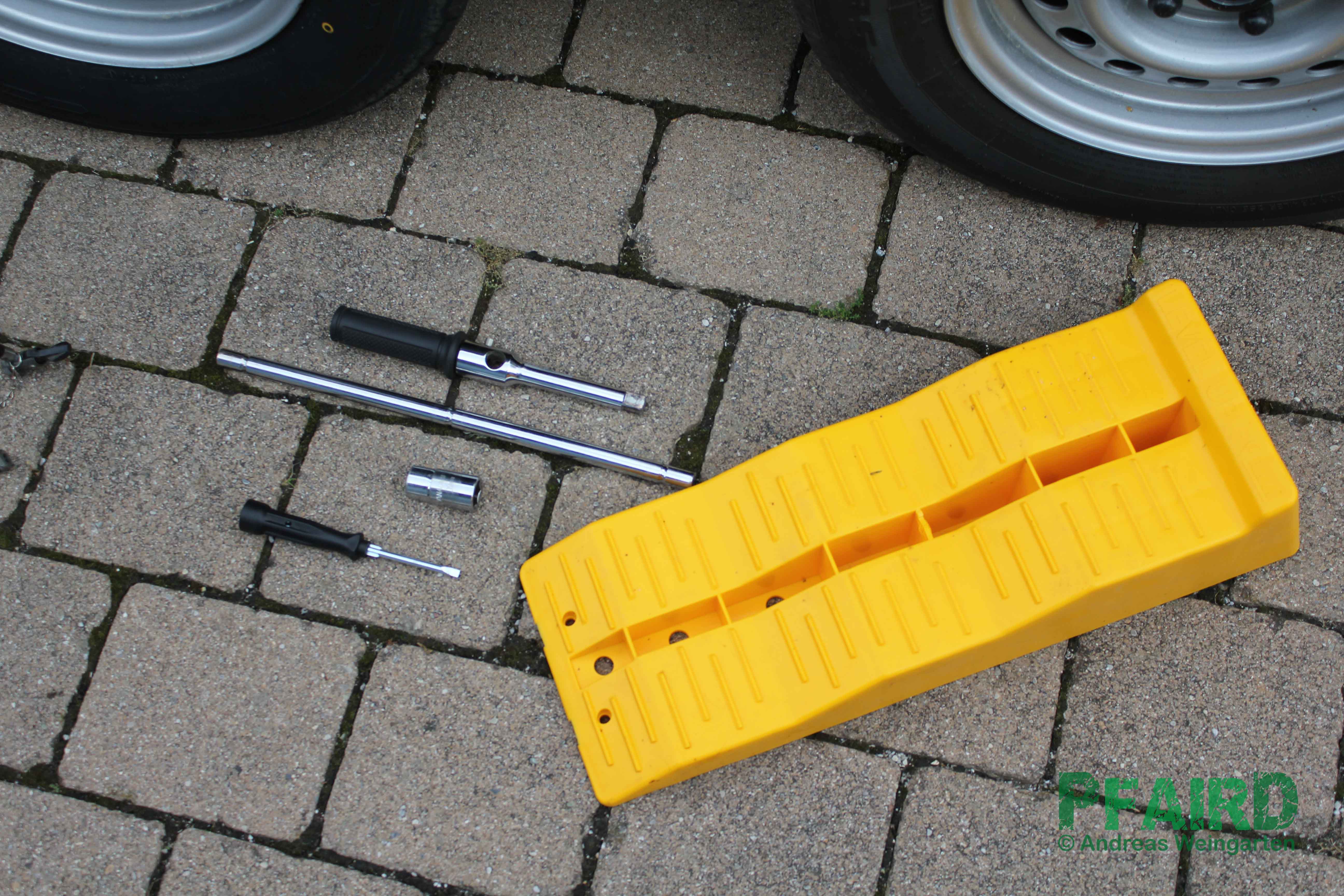 - Nach dem Montieren des Ersatzrades oder des reparierten Rades wird die Feststellbremse am Hänger und Zugfahrzeug gelöst und der Hänger vom Keil heruntermanövriert. Muttern nachziehen, Keil einpacken, fertig.