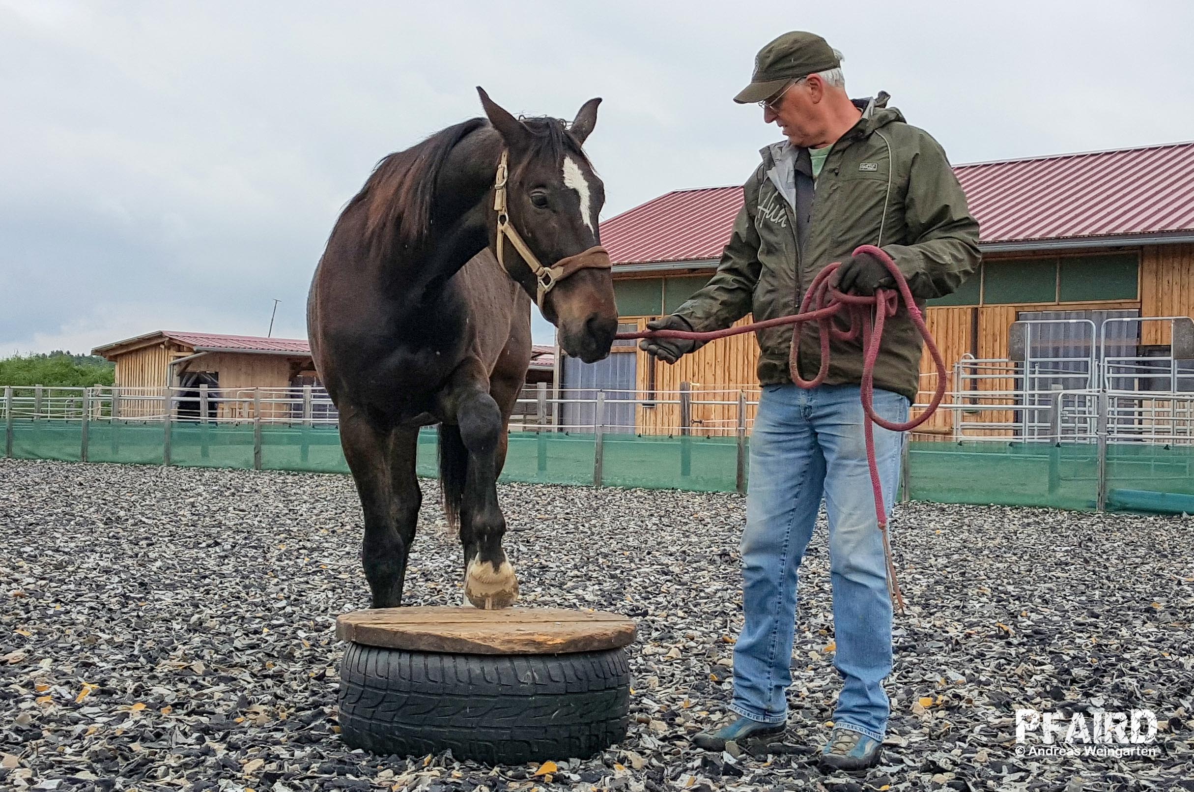 Die drei Pferde stehen direkt am Haus und werden von den beiden Züchtern Nicole und Walter Fraunsdorfer liebevoll versorgt. Auch das Fohlen ABC, Antischeutraining und der Bezug zum Menschen werden so hergestellt. Löwenherz wies in den Jahren bei uns immer ein Defizit (im Vergleich zu Platini) im sozialen Kontext auf. Er war im Zusammenleben mit anderen Pferden sehr „naiv“ und konnte oft die Pferdesprache erst mit deutlichem Ausdruck verstehen. Manches Mal wurde er deshalb „Opfer“ dominanter Pferde (Bisse, Schläge usw.). Löwenherz hatte auch einige Probleme mit Menschen. Er war sehr viel scheuer als Platini und so war die von uns angedachte Ausbildungsmethode für ihn viel existentieller als für Platini. Wir gaben Löwenherz viel mehr Zeit für einzelne Schritte und auch seiner Psyche schenkten wir viel Aufmerksamkeit. Seiner Neigung zum Scheuen begegneten wir mit Geduld und viel Ruhe. Hier kam es aber immer wieder zu Rückschlägen (im Stall, im täglichen Handling, in der Klinik) durch Menschen, die seine Scheu als Aggression werteten und heftig und zum Teil auch sehr körperlich reagierten (große Abwehrgesten, Schläge, Zwangsmaßnahmen). Meine persönliche Bindung zu diesem Pferd wurde durch diese Ausbildung sehr eng und durch seine lange Krankheit und die dadurch anfallenden Sonderaufgaben (Verbände, Beruhigung, Versorgung) sehr persönlich.