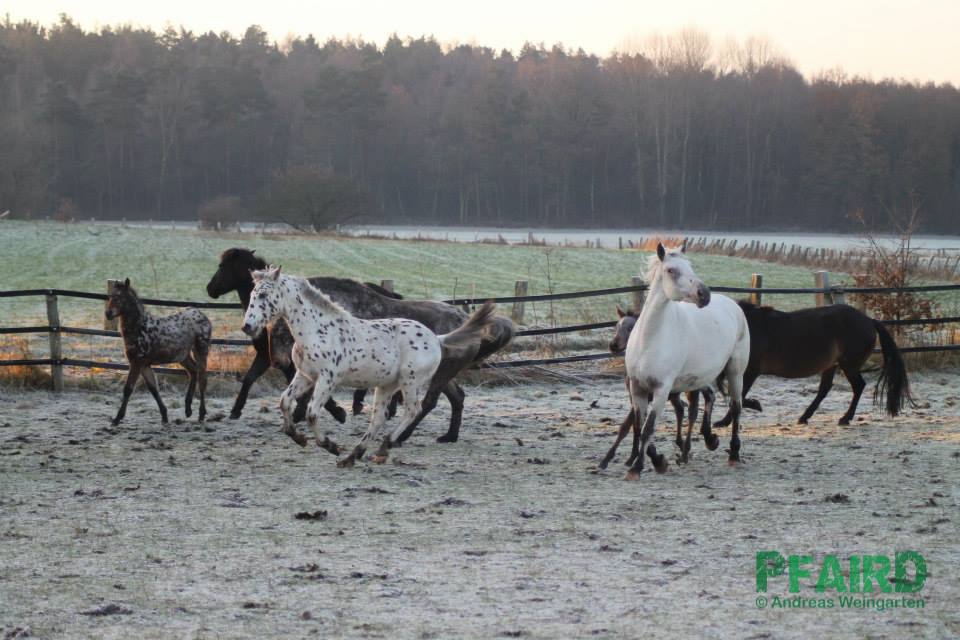 Die Fohlen und ihre Mütter kommen dann zur Stutenherde und Platini hatte so ein gleichalteriges Mädel an seiner Seite und stets eine Spielgefährtin. Auch die Stuten in verschiedenen Altersklassen widmeten sich dem Kleinen. Sein Laufbedürfnis konnte er ungebremst ausleben und verbrachte seine Ersten Monate so ideal im Offenstall.