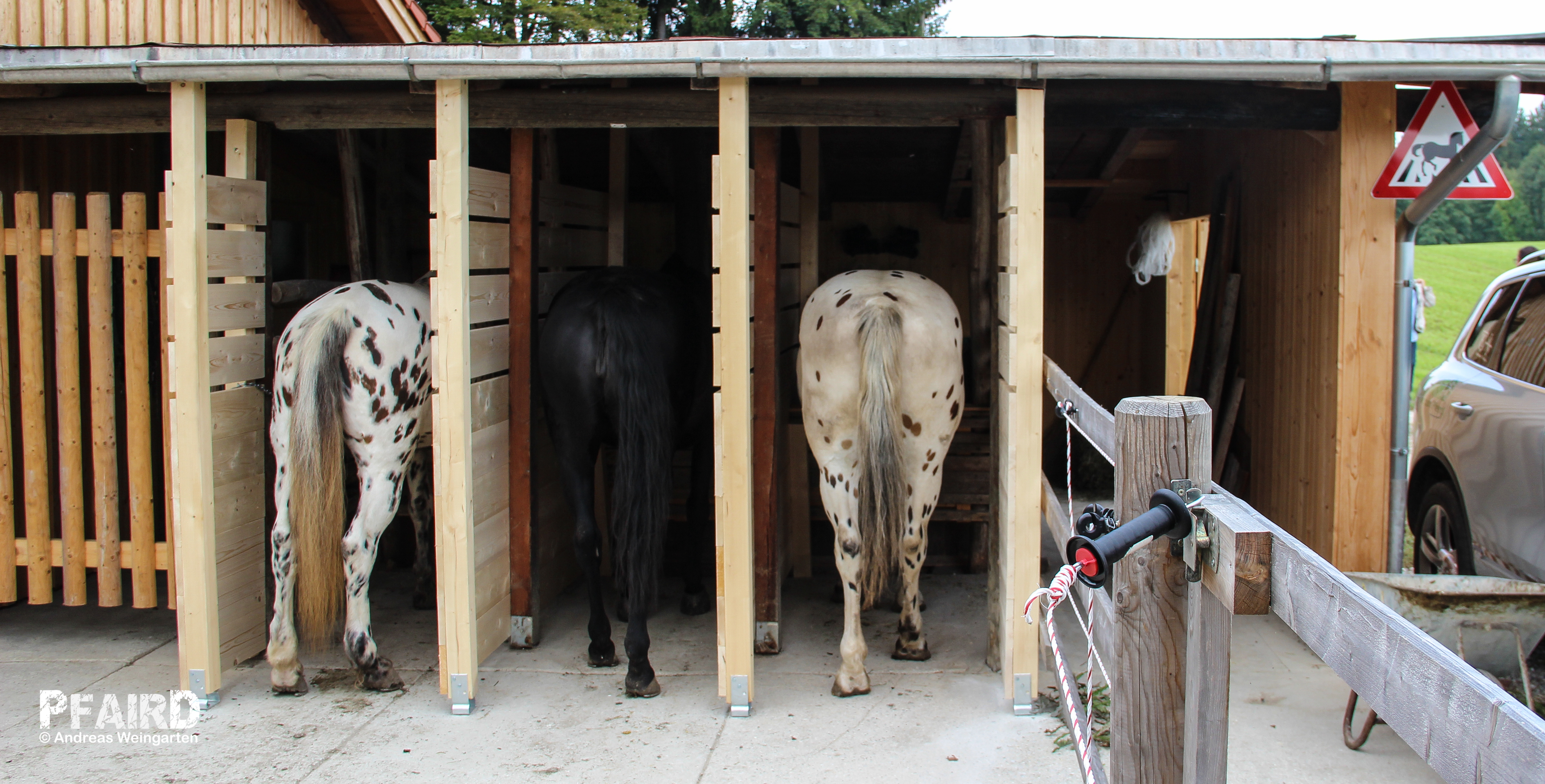 Als zweite Futterquelle haben wir drei überdachte Fressständer für die Heugabe in klassischen Heunetzen (4 x 4 cm) und für die Gabe des Zusatzfutters (in Eimern, welche in den Futtertrog gestellt werden). Das Heu ist hier nicht permanent sondern wird von uns bei Schlechtwetterperioden dort platziert. So können die Pferde dann zwischen Raufe und Fressständer wechseln und auch im Trocknen fressen.