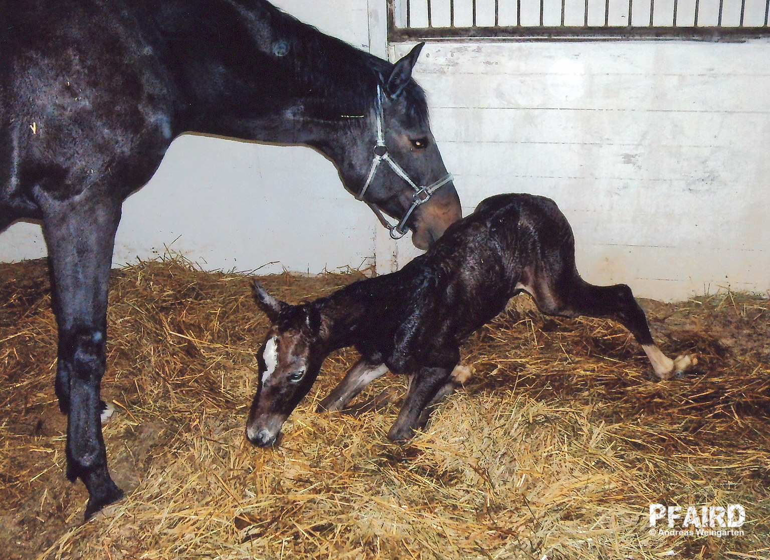 Die drei Pferde stehen direkt am Haus und werden von den beiden Züchtern Nicole und Walter Fraunsdorfer liebevoll versorgt. Auch das Fohlen ABC, Antischeutraining und der Bezug zum Menschen werden so hergestellt. Löwenherz wies in den Jahren bei uns immer ein Defizit (im Vergleich zu Platini) im sozialen Kontext auf. Er war im Zusammenleben mit anderen Pferden sehr „naiv“ und konnte oft die Pferdesprache erst mit deutlichem Ausdruck verstehen. Manches Mal wurde er deshalb „Opfer“ dominanter Pferde (Bisse, Schläge usw.). Löwenherz hatte auch einige Probleme mit Menschen. Er war sehr viel scheuer als Platini und so war die von uns angedachte Ausbildungsmethode für ihn viel existentieller als für Platini. Wir gaben Löwenherz viel mehr Zeit für einzelne Schritte und auch seiner Psyche schenkten wir viel Aufmerksamkeit. Seiner Neigung zum Scheuen begegneten wir mit Geduld und viel Ruhe. Hier kam es aber immer wieder zu Rückschlägen (im Stall, im täglichen Handling, in der Klinik) durch Menschen, die seine Scheu als Aggression werteten und heftig und zum Teil auch sehr körperlich reagierten (große Abwehrgesten, Schläge, Zwangsmaßnahmen). Meine persönliche Bindung zu diesem Pferd wurde durch diese Ausbildung sehr eng und durch seine lange Krankheit und die dadurch anfallenden Sonderaufgaben (Verbände, Beruhigung, Versorgung) sehr persönlich.