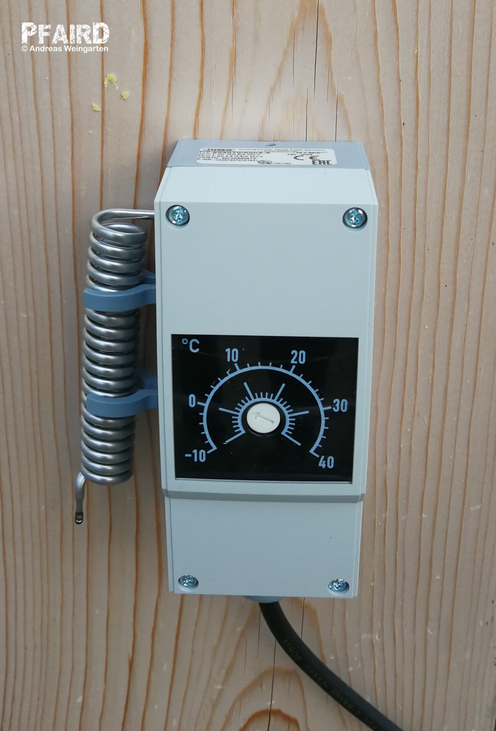 Um den Tränker frostfrei zu machen habe ich ein Thermostat installiert, welcher die Tränkeheizung steuert. Unter 5°C wird nun die Heizung unter dem Tränkebecken eingeschaltet. Das funktioniert sehr gut. Man sollte beim Thermostat darauf achten, ihn in der Nähe der Tränke zu installieren um dieselben klimatischen Bedingungen wie der Tränker zu bekommen…