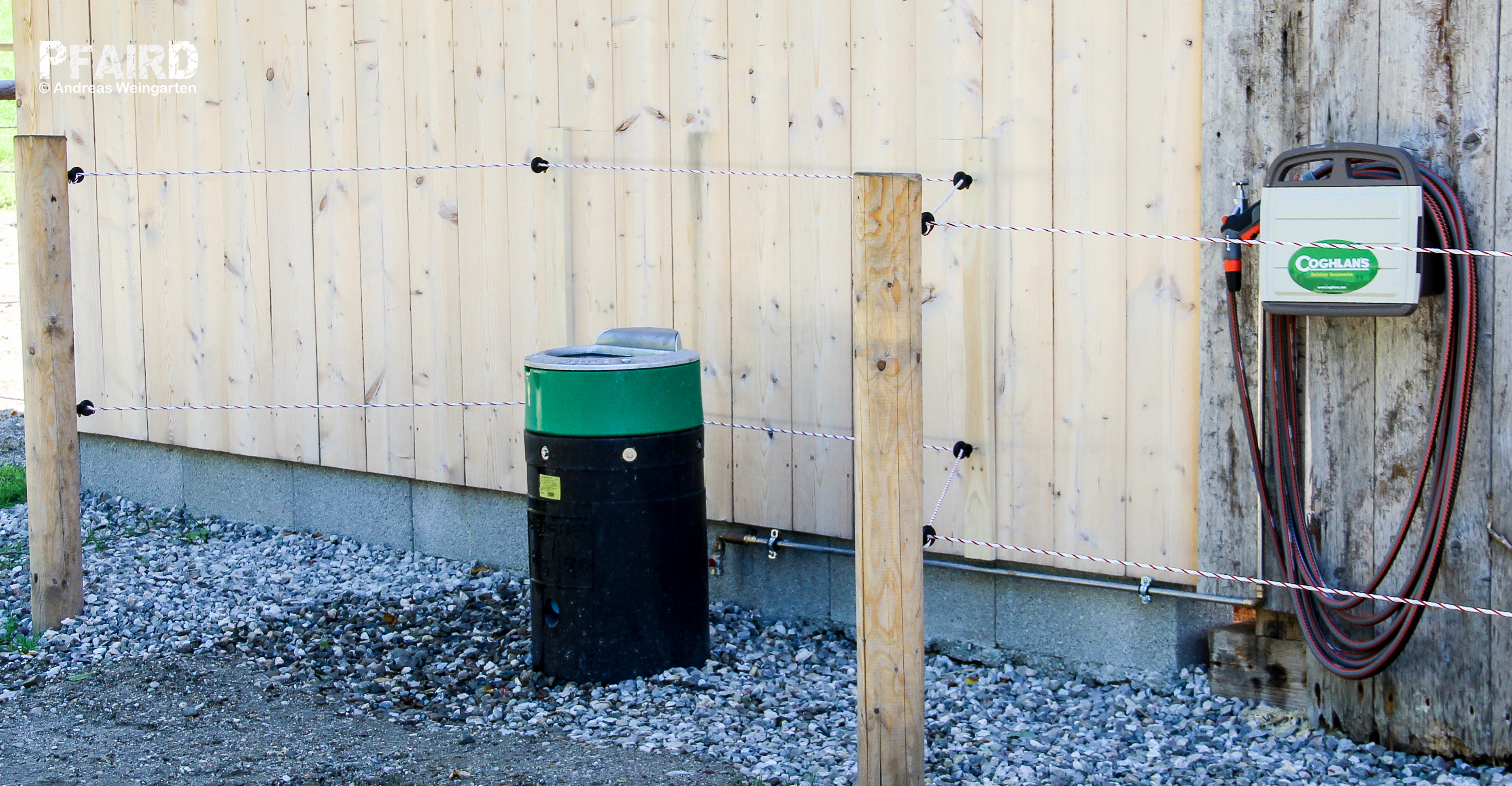Wir haben eine frostfreie Tränke mit Trinkwasserzufluss installiert. Sie steht auf einem isolierten Fuß an der Rückseite des Stallgebäudes und entgegengesetzt der Futterraufe (Bewegungsanreiz). Die Tränke wird bei Temperaturen unter 5° Celsius automatisch beheizt. Der Tränker ist ein sogenannter Saugtränker. D. h. der Wasserstand wird schwimmergesteuert aufgefüllt und die Pferde können einfach saugen. Der Tränker ist sehr gut zu reinigen (Edelstahl) und die Pferde haben diese Tränke sehr gut angenommen. Für drei Pferde reicht diese eine Säule aus. Erfahrungen aus anderen Ställen haben uns gezeigt, dass die sogenannten „Zungentränker“, also Tränker, wo nur Wasser fließt, wenn das Pferd mit der Nase die Zunge des Tränkers drückt, nicht immer zu ausreichendem Konsum anregen. Wasser ist aber die Basis für Alles. Der Kreislauf, die Verdauung, die Umsetzung von Nahrung sowie die Gesunderhaltung der inneren Organe hängen alle an der ausreichenden Wasserversorgung.